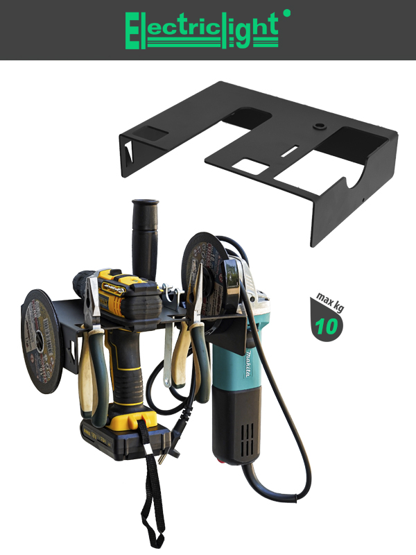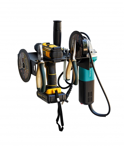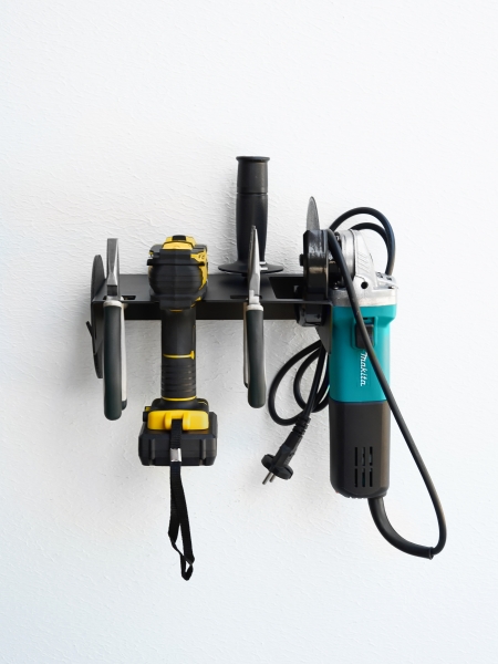 Этот настенный кронштейн идеально подходит для использования в гараже, мастерской или на складе, обеспечивая удобное и безопасное хранение вашего шуруповерта и болгарки (УШМ).