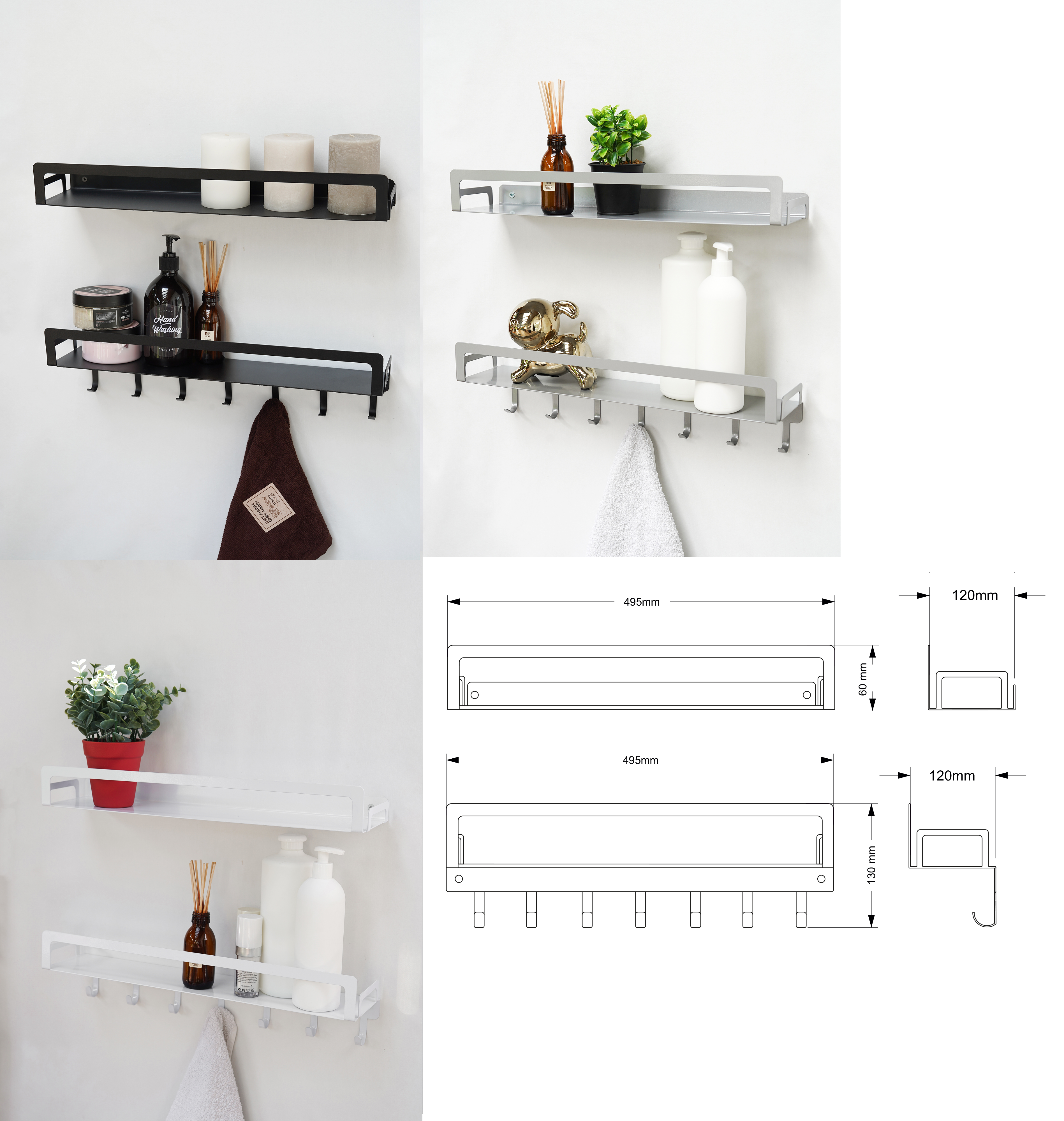 Набор металлических настенных полок 2шт 1 полка + 1 с крючками.
