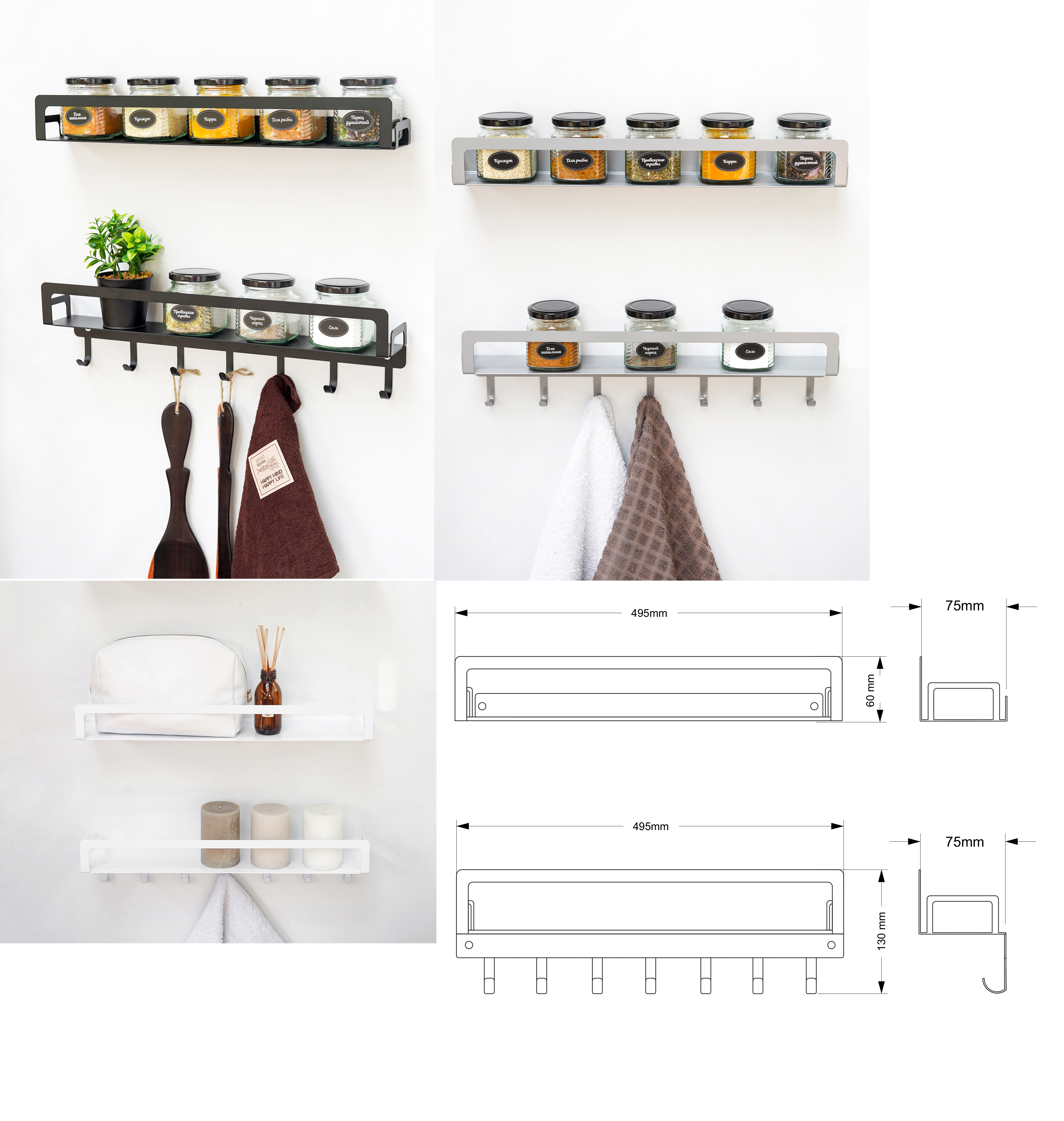 Набор металлических настенных полок 2шт 1 полка + 1 с крючками.