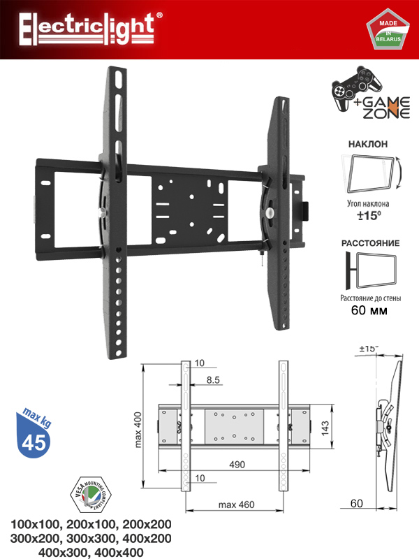 | Макс. расстояние между крепежными отверстиями | 460х400мм |