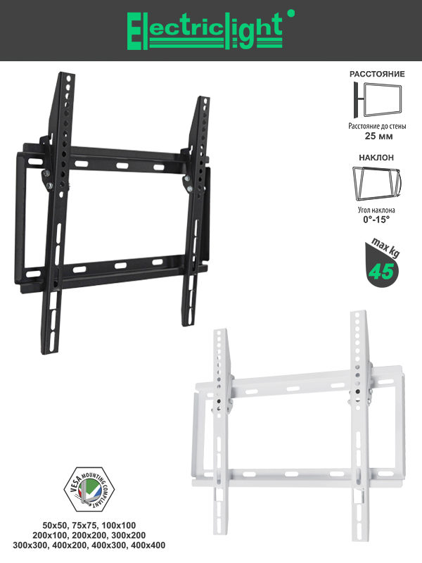 | VESA | 50x50, 75x75, 100x100, 200x100, 200x200, 200x300, 300x100, 300x200, 300x300, 400x200, 400x300, 400x400 |